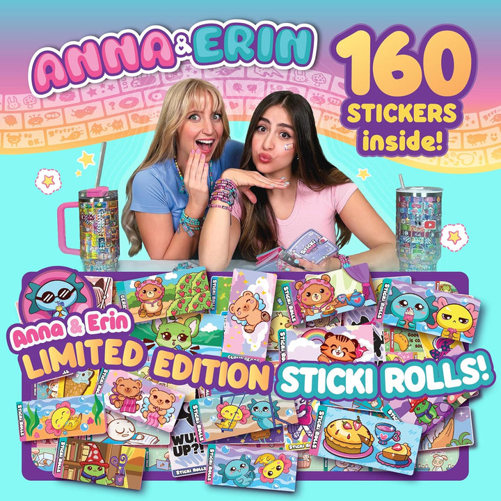 Anna & Erin BFF Sticki Rolls are the latest addition to the Sticki Rolls collection, featuring unique designs curated by popular influencers Anna and Erin. Each set includes two vibrant bracelets, each adorned with four Sticki Rolls and personalized “A&E” charms, allowing friends to share, collect, and wear their favourite stickers. The package also contains eight additional replacement Sticki Rolls, providing 160 stickers for endless decorating and trading fun!
