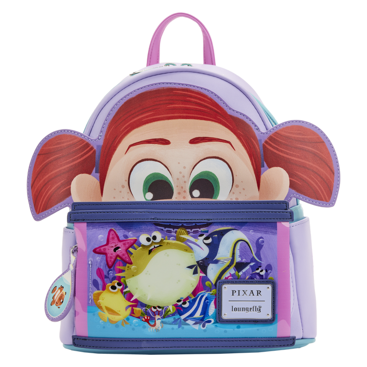 Darla Sharman - niece of Phillip, and (accidental) fish killer, is one of the more recent and unusual additions to Disney's long line of antagonists in the Pixar favourite Finding Nemo. This Loungefly mini backpack perfectly pays homage to her character, with tons of great detail including a fish bag zipper charm and a small print on the reverse of the bag that references her “Rock n Roll Girl” sweater she is seen wearing in the film.