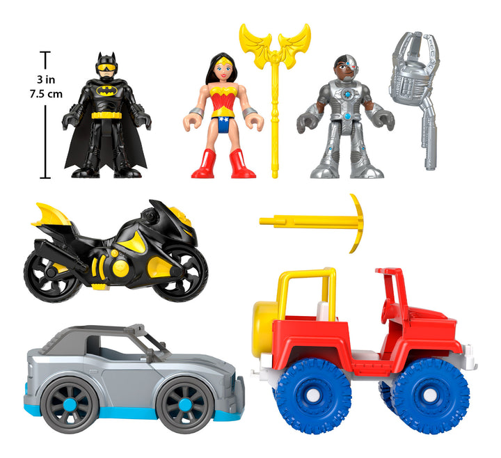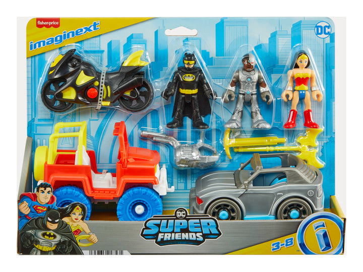 • Imaginext figure and vehicle gift set featuring DC super friends characters batman wonder woman and cyborg for action-packed preschool pretend play
