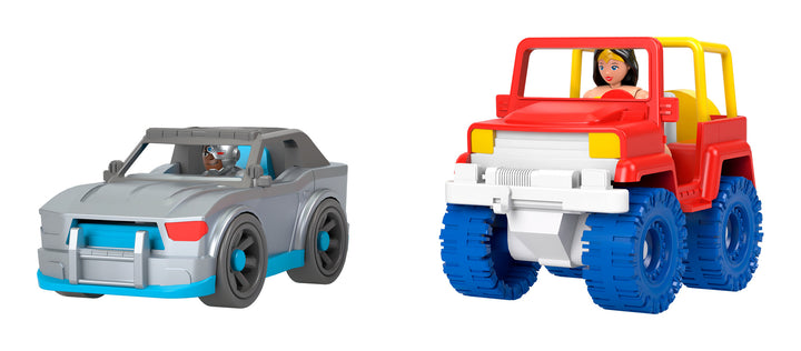 • Kids can send each DC super hero rolling into action with their own rescue vehicle batman on his batcycle wonder woman in a 4 x 4 and cyborg in a race car