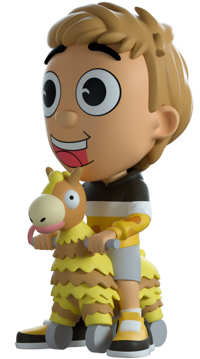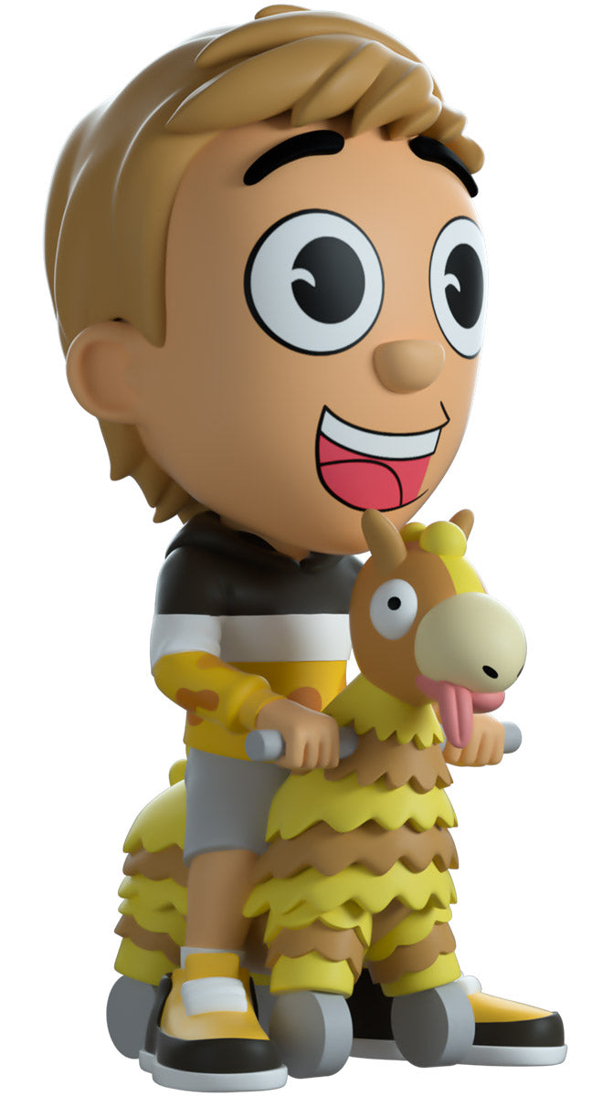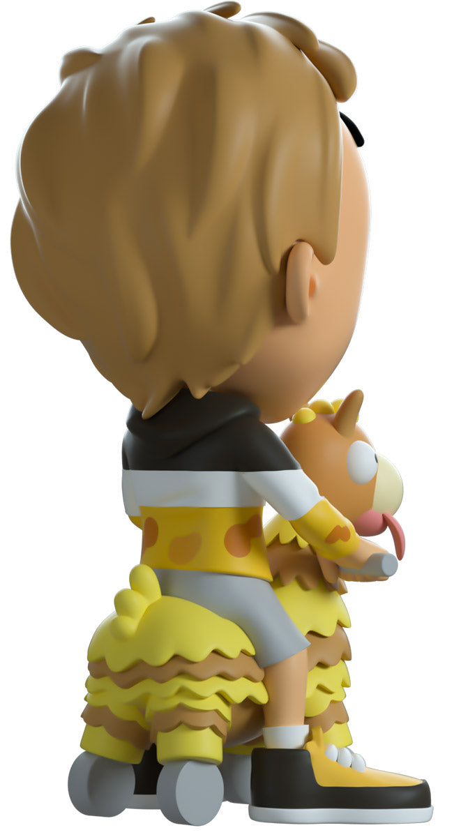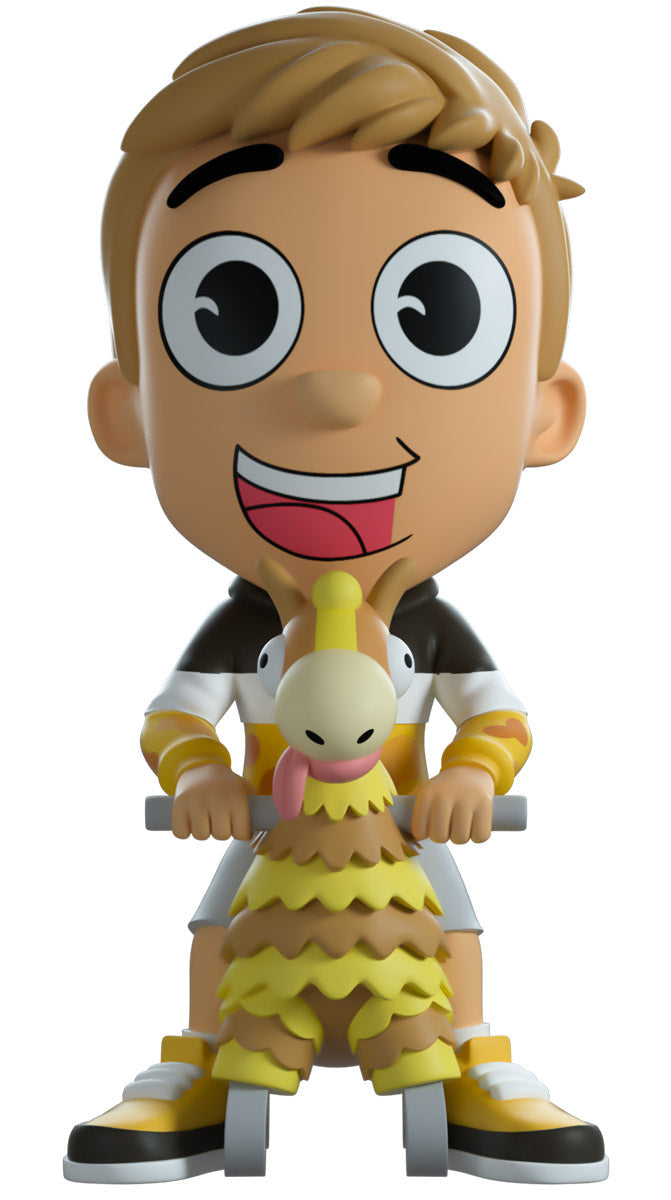 The FGTeeV family arrives to Youtooz with their vinyl figure debut! Chase stands at 4.4 inches tall with an excited smile on his face and is dressed in a hoodie that has the block colors of black, white, and yellow. He has gray shorts on with matching black, white, and yellow sneakers and is posed by sitting on a llama on wheels that is colored both yellow and brown with a tiny tongue sticking out. The exterior of the windowed display box shows a bunch of cute and derpy looking llamas in front of a orange background with yellow stars. The interior of the box is a series of colorful squares, while the protective packaging continues the orange starry motif as his figure can be seen through the large clear window at the packaging’s front. This collectible was designed in collaboration with community member @therealracckun and ships in a matte, embossed, protective outer sleeve with a custom-sized plastic protector for maximum protection during shipping.