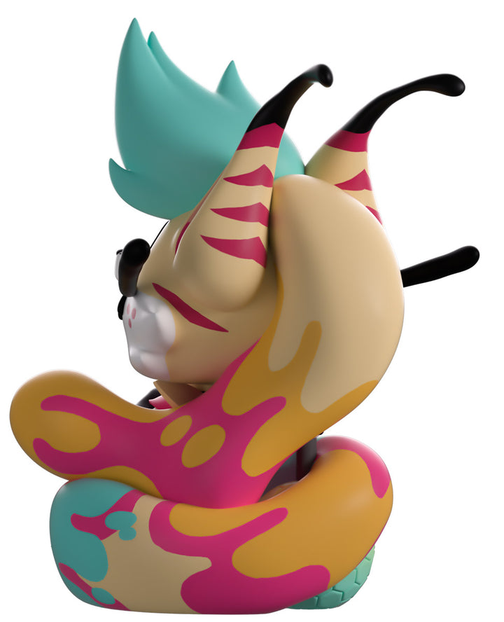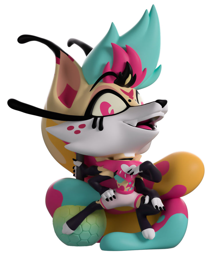 Beelzebub has arrived at Youtooz to throw the most spectacular party around, and you’re invited! Prancing forward at 4.6 inches tall with a huge smile stretching across her foxy face white face that has bright ink spots on the cheeks and long eyelashes that stretch out to the sides, turquoise and pink fair flick up from between two curling ears to run down her back in colorful splotches that wrap around a honeycomb pattern ball. Always the absolute life of the party, Beelzebub wears a colorful top that matches her tail and has a pointed collar with a heart on the chest with pink short shorts. The exterior of her packaging sees their light and shapely silhouette against a deep orange background, while the interiors showcase a huge honeycombed disco ball that shines onto bright walls. The protective sleeve is then patterned with diagonal yellow stripes and printed with the ‘Helluva Boss’ logo as their figure can be seen through the large clear display window at its front. This collectible ships in a matte, embossed, protective outer sleeve and a custom-sized plastic protector for maximum protection during shipping.