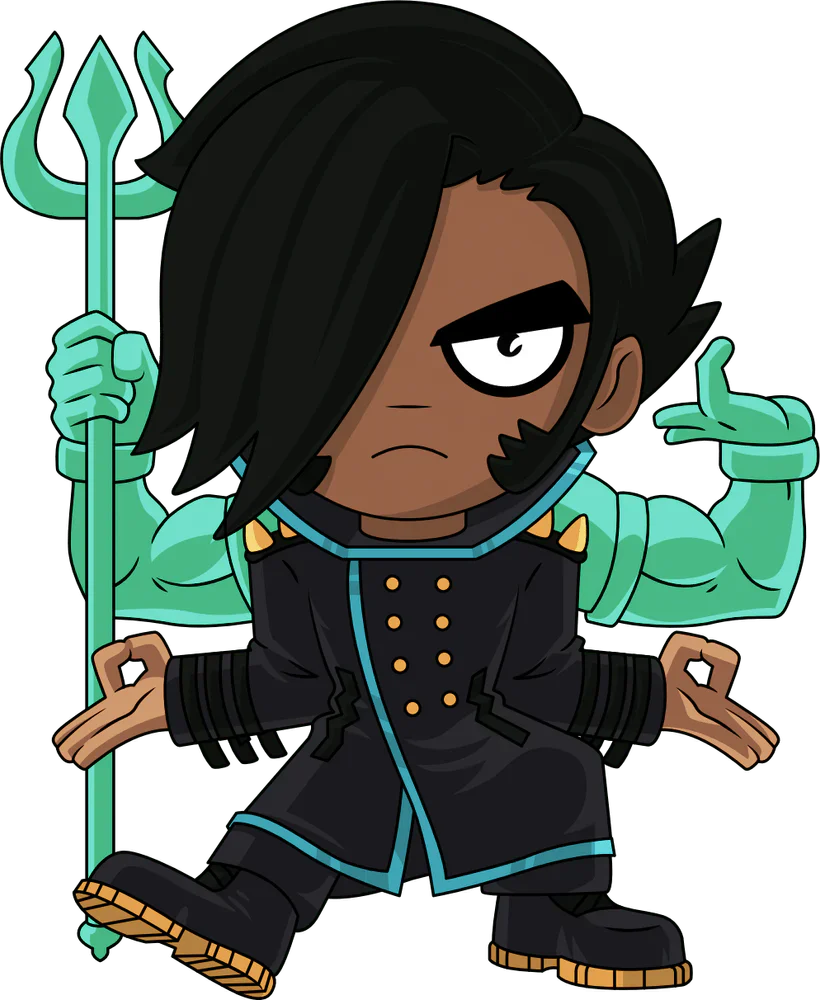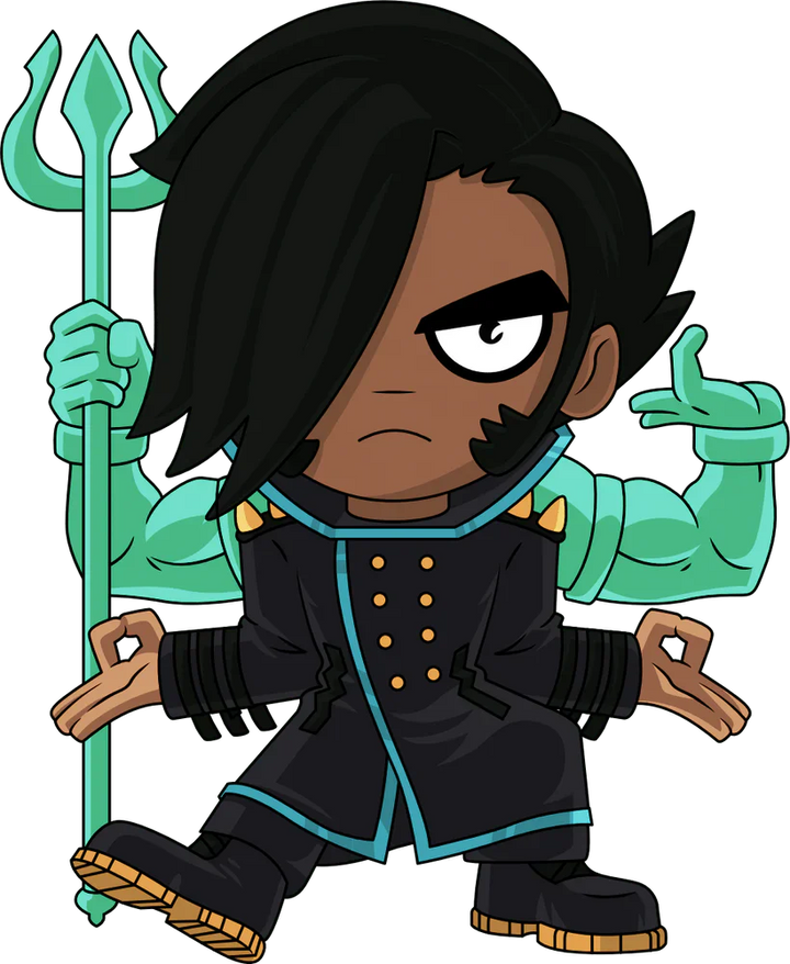 Now this is one Ex you don’t want to mess with! Well… maybe a little… At 4.5 inches tall with a pair of muscular spectral arms emerging from his shoulders and holding an ornate trident to the ground, Matthew's chunky black fringe falls down to cover half of a stern face as a thick sideburn curls up his cheek. With the elbows of his human arms pressed into his sides and hands jutting out with his thumb and forefingers pressed together, he wears a long black coat with a blue trim and golden buttons. The exterior of his blue, red and maroon packaging is covered in 8-bit green flames, while the interior is streaked with red and purple lines. The protective sleeve is a dark blue covered in pink hearts and bright sparkles as his figure can be seen through the large clear window at the packaging’s front. This collectible ships in a matte, embossed, protective outer sleeve and a custom sized plastic protector for maximum protection during shipping.