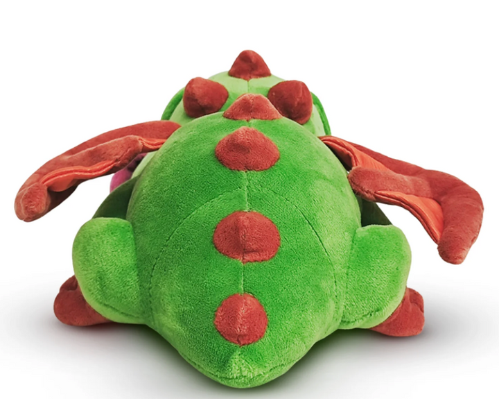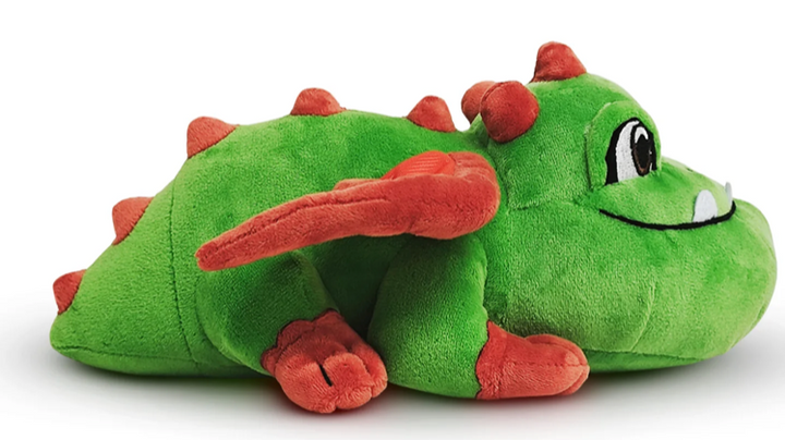 No village is safe without its own fire-burping security system! Well, you're in luck -- baby dragons are now available to order! This cute green dragon is 9 inches long and loafing on his belly. His red paws pop next to his bright green body, with matching red wings and spinal spikes. He has a bright smile and a ping tongue that hangs out the side of his mouth. This plush is packed to the seams with 100% PP cotton and is made of the softest minky material, perfect for cuddling or building a village with!
