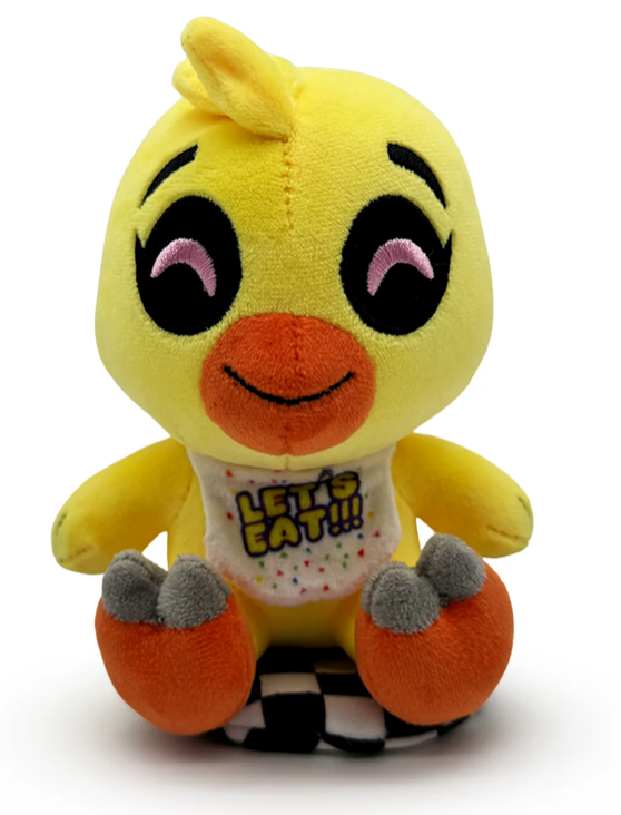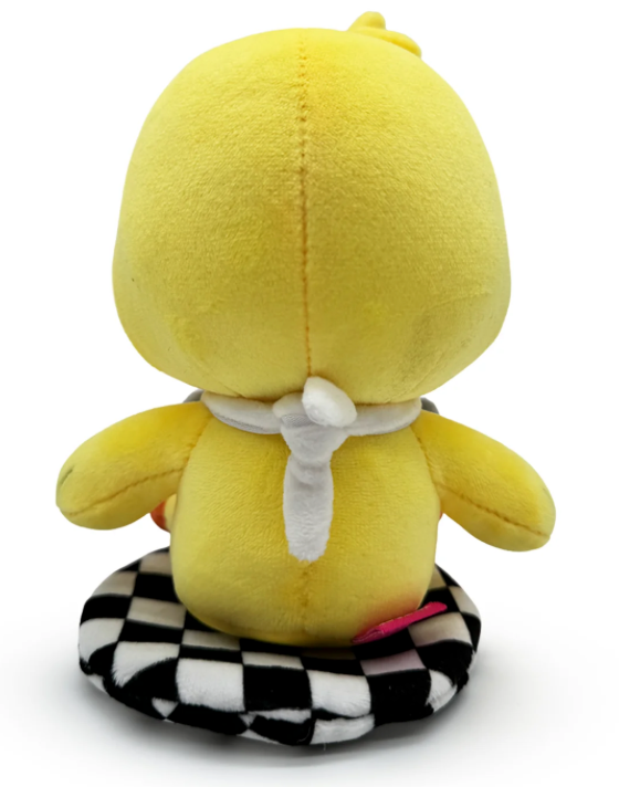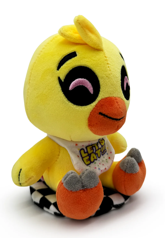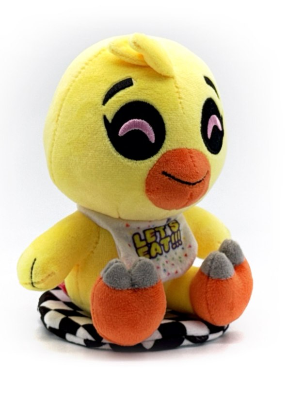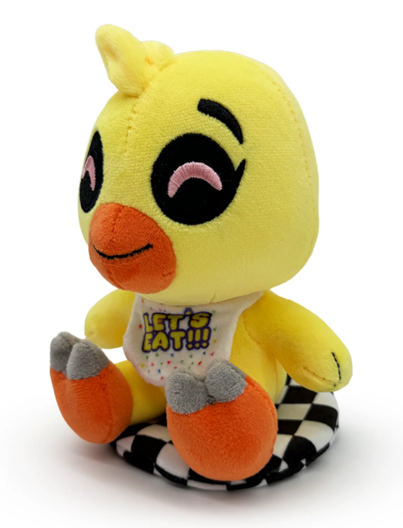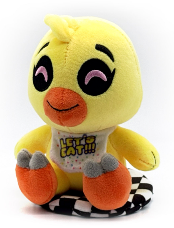 ‘Pizza… You want Pizza!’ Wait, who said that? Where are they?! Oh it’s Chica, back to be the perfect buddy to eat with! Well… to watch you eat really… Sitting at 6 inches tall with a smile crossing her small orange beak as bright pink pupils shine out from dark lashed eyes and a pair of feathers stick out from the top of her yellow head, she wears her favorite ‘Let’s Eat!!!’ bib tied around her neck as she kicks her taloned feet forward. This plushie is made of the softest minky material, is packed to the seams with the most huggable squishy 100% PP cotton and comes equipped with a magnetic disc to let it perch firmly atop your shoulder as the best accessory and a true testament to your love of the fandom!