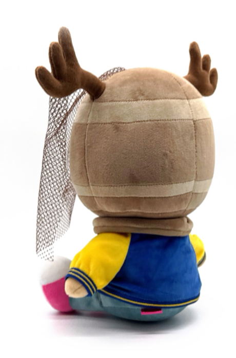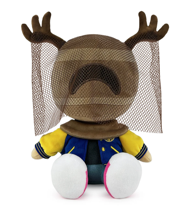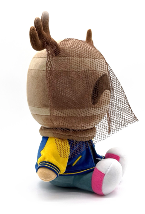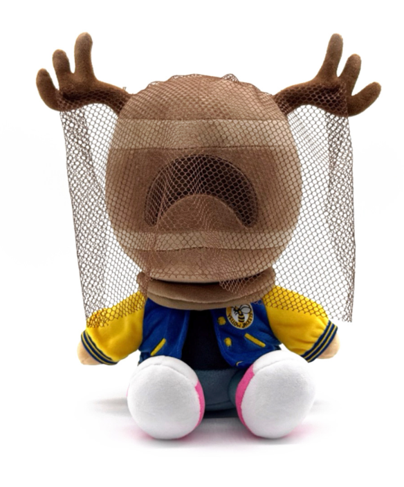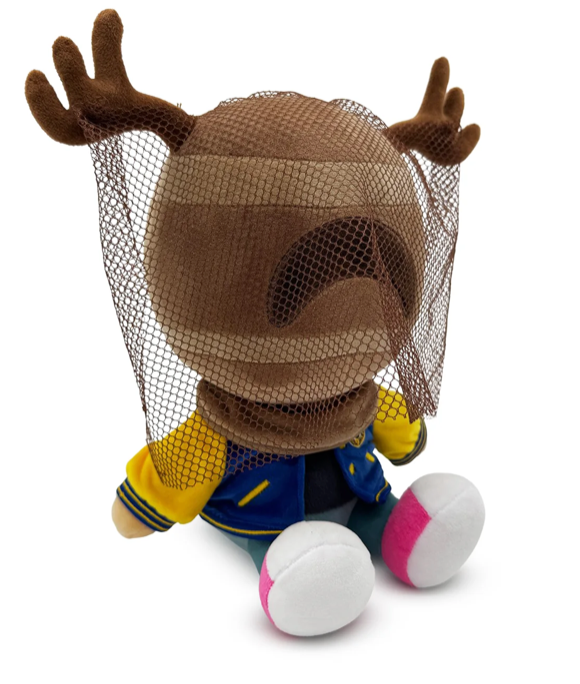Youtooz has stumbled into a strange ritual in the thick of the forest and been confronted by the most mysterious plush! Sitting at 9 inches tall with their face obscured by a thick striped mask as curved brown antlers rise from the top of their head, a thin fishnet drapes down past their shoulders to shroud them in true mystery. Wearing a puffy varsity jacket with bright yellow sleeves and a blue torso that has a wasp on the chest, their blue jean wearing legs kick forward as pink and white sneakers cover their feet. This plush is packed to the seams with 100% PP cotton and is made of the softest minky material and fishnet, absolutely perfect for cuddling or being mysterious with!