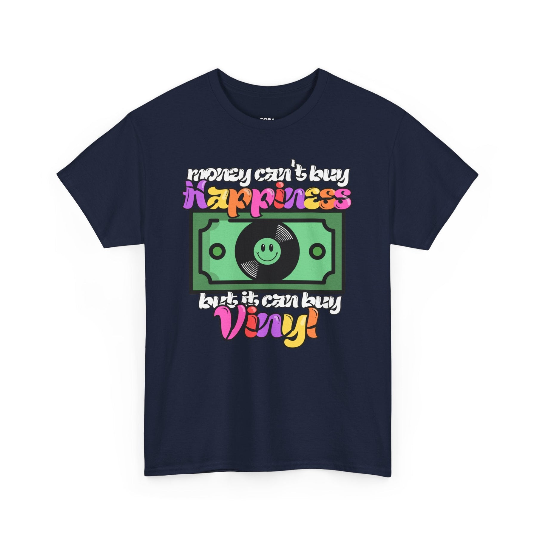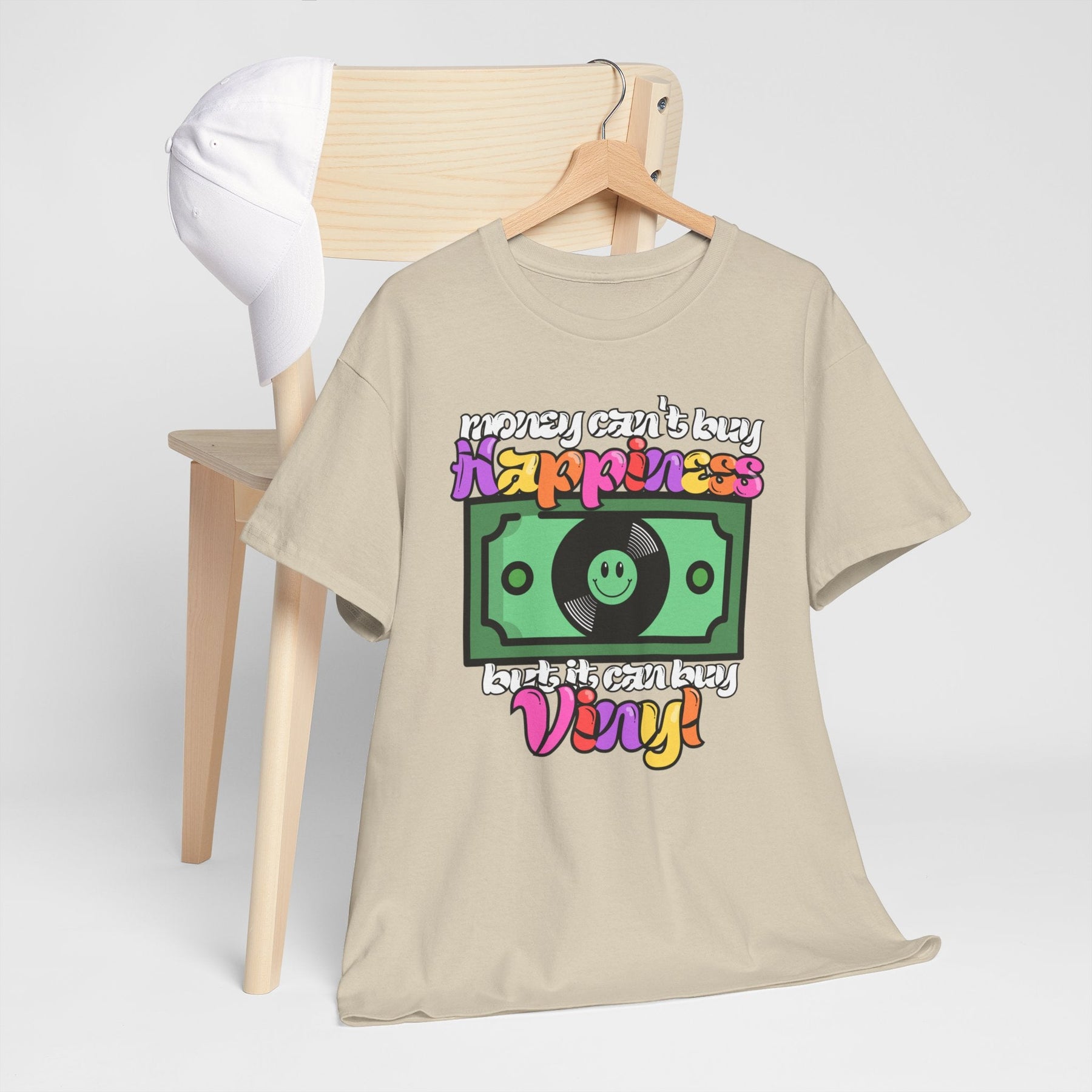 Money can't buy happiness, but it can buy vinyl! Show your love for vinyl records with this fun and comfy tee. The classic fit makes it perfect for music enthusiasts and fans of retro style. Ideal for casual wear or music events, this tee is durable and suitable for everyday wear or concerts.