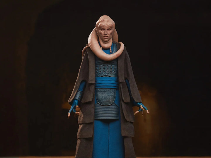 Inspired by the character’s appearance in Star Wars: Return of the Jedi, this fully articulated, highly poseable high-end Star Wars figure wears cut and sew clothing accurate to his on-screen look. Bib Fortuna’s courtly outfit includes a long black cloak draped over a blue tunic, blue gloves, and a large chest plate. Additionally, Bib Fortuna’s outfit features black boots and wrist armor. The Bib Fortuna Sixth Scale High-End Collectible Figure also comes with two sets of hands so that collectors can recreate his expressive gestures from the movie.