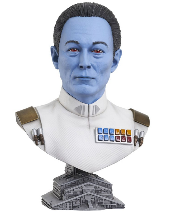 Grand Admiral Thrawn is a legend in the Empire, and now he's a Legend in 3-D! The live-action Thrawn has finally been revealed in the Disney+ series Star Wars: Ahsoka, and Gentle Giant Ltd. is celebrating with a portrait of the blue-skinned villain in bust form! Measuring approximately 10" tall, this 1/2 scale bust sits atop a Star Destroyer base, and is limited to only 1,000 pieces. It comes packaged with a numbered certificate of authenticity in a full-color box.