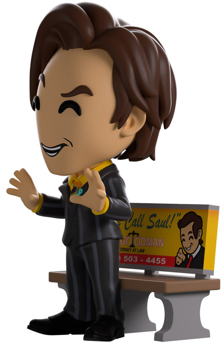 Don't worry friends, we've got the best lawyer on speed dial! Saul is trying a new case and has returned to Youtooz for research! Standing at 5 inches tall in front of his bus bench advertising his law services, his hands spread out in as an eyebrow raises beneath slicked brown hair! Always dressed looking his best for the courtroom, he wears a striped black suit over a yellow shirt and multicolored tie. The exterior of his packaging then looks onto an empty park as his figure can be seen through the large clear window at its front. This collectible ships in a matte, embossed, protective outer sleeve and a custom-sized plastic protector for maximum protection during shipping.