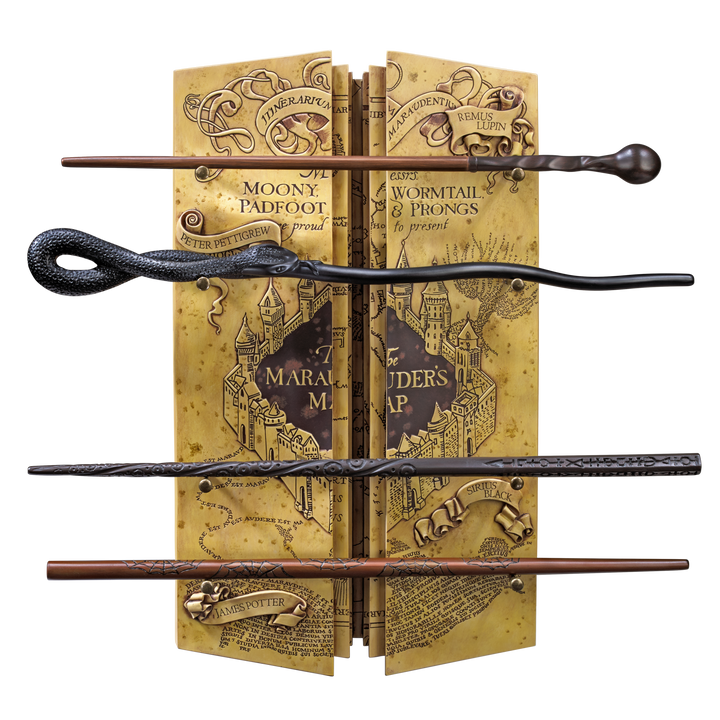 The wands of the four Marauders, Remus Lupin, Peter Pettigrew, Sirius Black and James Potter, on a hand-painted resin Maruaders Map display (measuring approx 36 x 21cms), with 2 keyhole hooks for wall mounting.