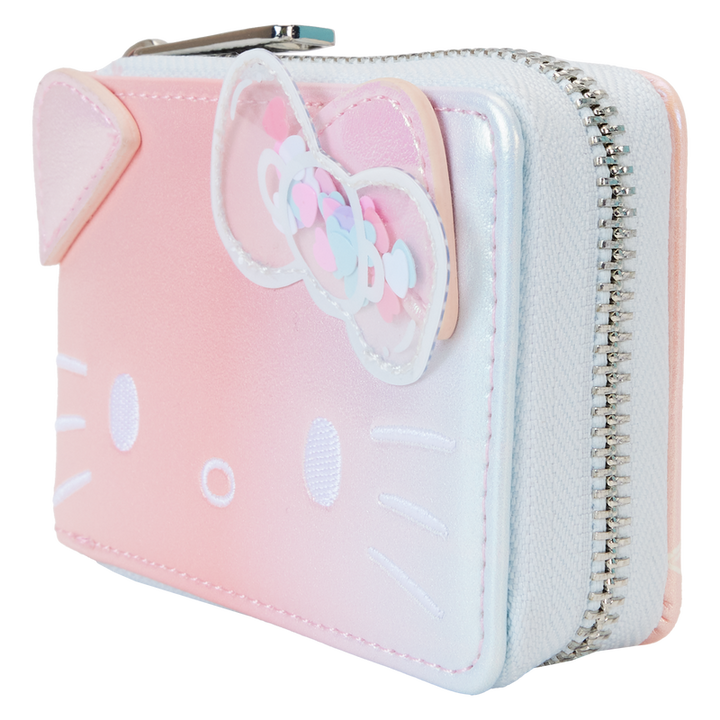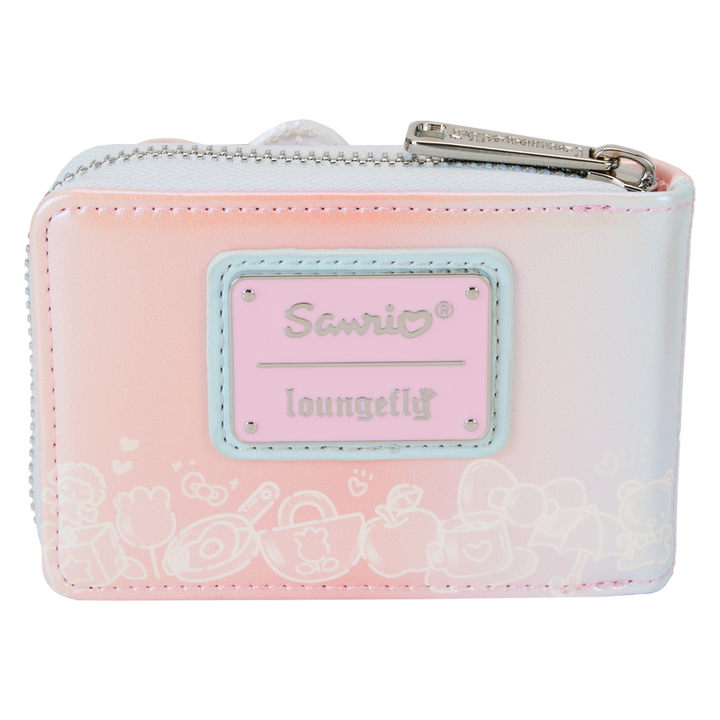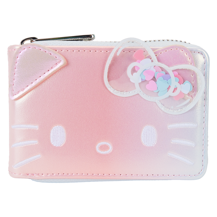 Guess who’s clearly sweet with a bow that’s neat! Break out the confetti to celebrate Hello Kitty’s 50th anniversary. This shiny pink iridescent cosplay wallet is full of surprises. And speaking of confetti…Hello Kitty’s clear bow at the top is filled with heart-shaped colorful confetti. Her applique ears stick up over the top, and her features are brought to life in white embroidered detail. On the back, frosted printed images of some of Hello Kitty’s favorite things appear, including a bow, a teddy bear, an apple, and more surprises. Inside, you’ll find several slots for holding cards or your ID. Secure your valuables for the day and celebrate in style.
