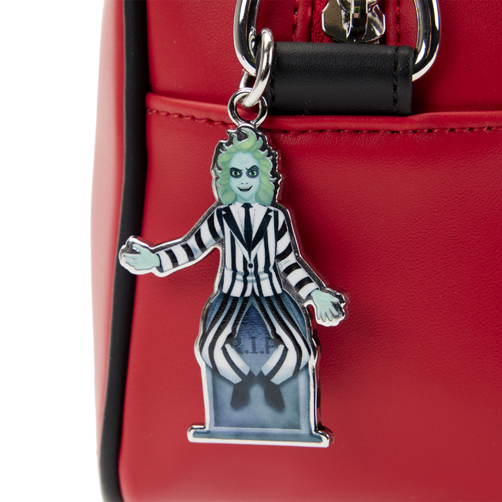The ghost with the most is on the job! Take a terrifically terrifying trip through the afterlife with this Loungefly Beetlejuice Graveyard Sign Crossbody Bag.