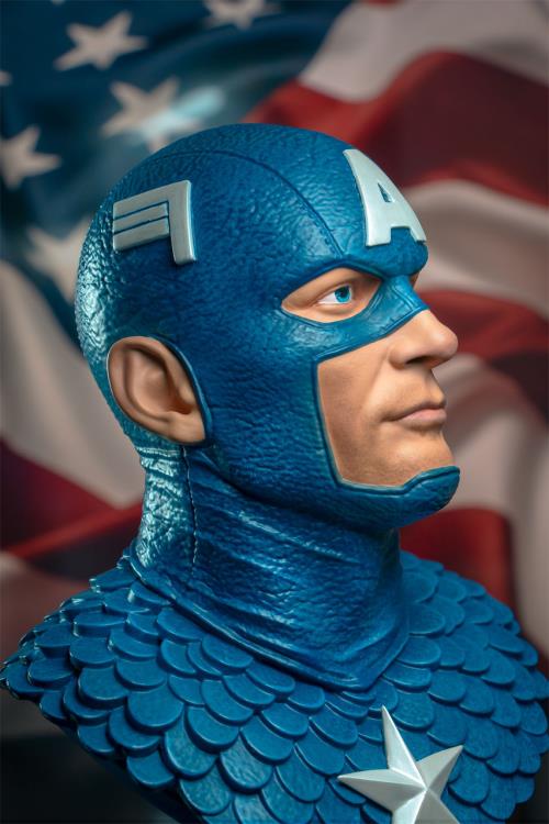 A Diamond Select Toys release! He's an American Legend! DST captures the first Avenger as a half-scale bust, the newest in the Legends in 3D line of busts. Measuring approximately 10 inches tall, this half-scale resin bust features incredible detail that's almost as large as life. Limited to only 1000 pieces, the bust comes packaged with a certificate of authenticity in a full-color hand-numbered box. Designed by Joe Allard, sculpted by Rocco Tartamella.