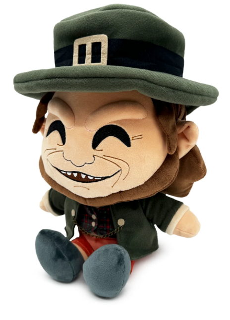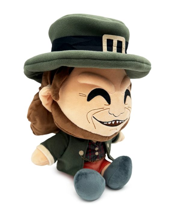 This Leprechaun has snuck into Youtooz in search of his missing pot of gold, oh and his Plush debut of course! Sitting at 9 inches tall with a sneering smile stretching across his wrinkled face to reveal a small row of sharp teeth, small pointed ears stick through his shoulder-length brown hair as a round black hat with a wide brim sits on the top of his head and has a buckle at its front. Dressed in a black blazer with a chain connecting each side over a tartan vest, he wears peach-colored shorts and black shoes. This plush is packed to the seams with 100% PP cotton and is made of felt, normal and sublimated minky and chain materials, absolutely perfect for cuddling and causing mischief with!