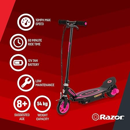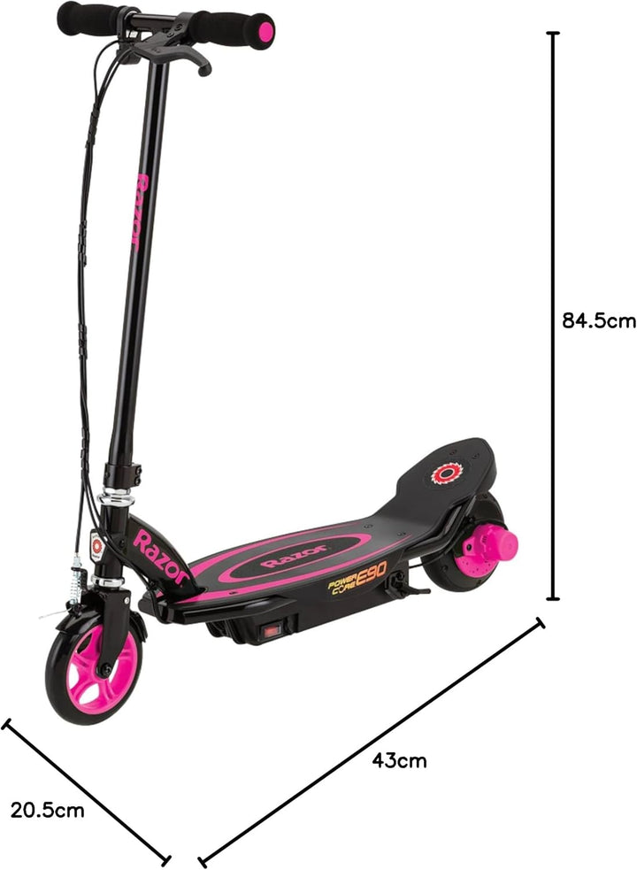 The Razor PowerCore E90 Electric Scooter Blue offers extended fun with up to 65 minutes of continuous ride time—about 75% longer than many other scooters. Powered by a 90-watt, maintenance-free, high-torque rear-wheel hub motor, it reaches speeds up to 10 mph (16 km/h) with smooth acceleration controlled by a convenient push-button throttle.