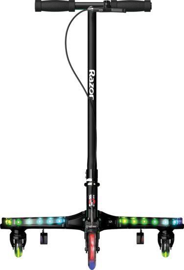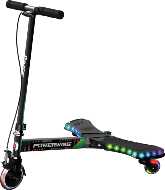 The Razor PowerWing Lightshow offers a thrilling ride with its unique side-to-side motion powered by dual inclined rear caster wheels, perfect for spinning, drifting, and endless fun without pushing. Its translucent wing platforms showcase over 30 vibrant multi-colored LED lights with five dynamic modes, creating a dazzling light show that’s motion-activated to save battery life.