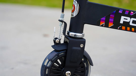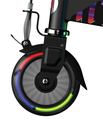The caster wheels themselves light up, adding extra flair during every drift and spin. Built with a durable steel main beam and high-tech polymer wings, this scooter supports riders up to 65 kg and features a hand-operated front brake and comfortable foam grips for enhanced control.