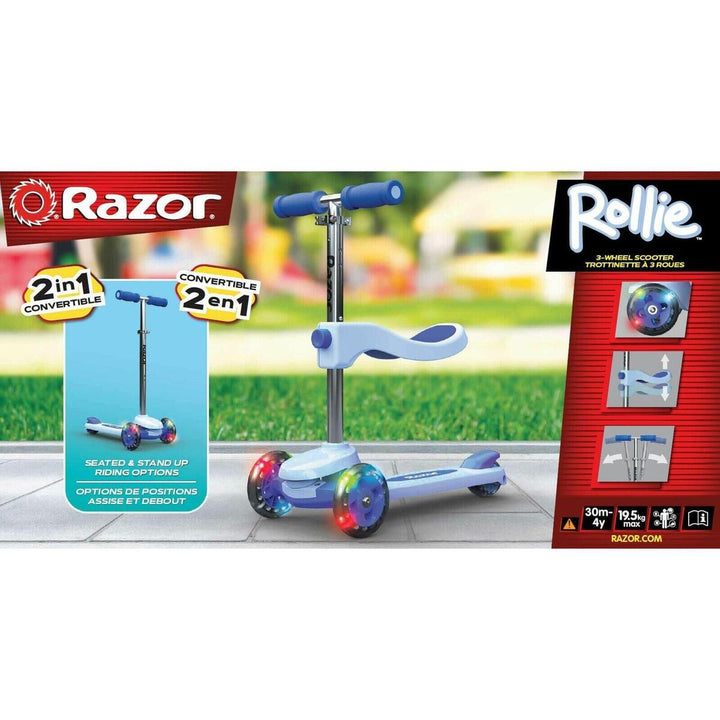 Featuring multi-color LED lights in the front wheels and deck, the scooter lights up with every ride, adding extra fun and visibility. With a padded, adjustable seat and durable urethane wheels, the Rollie Blue combines comfort, safety, and excitement for young riders.