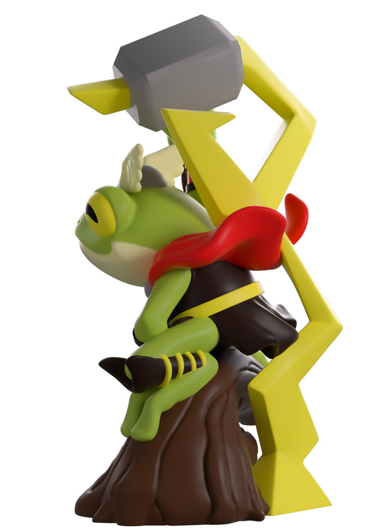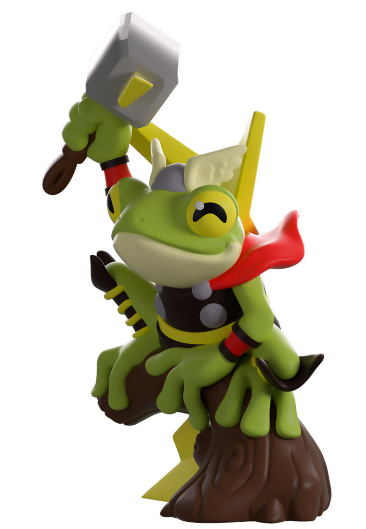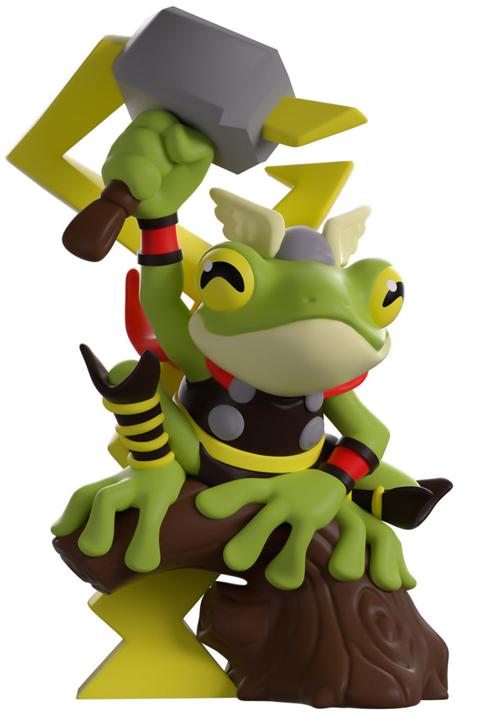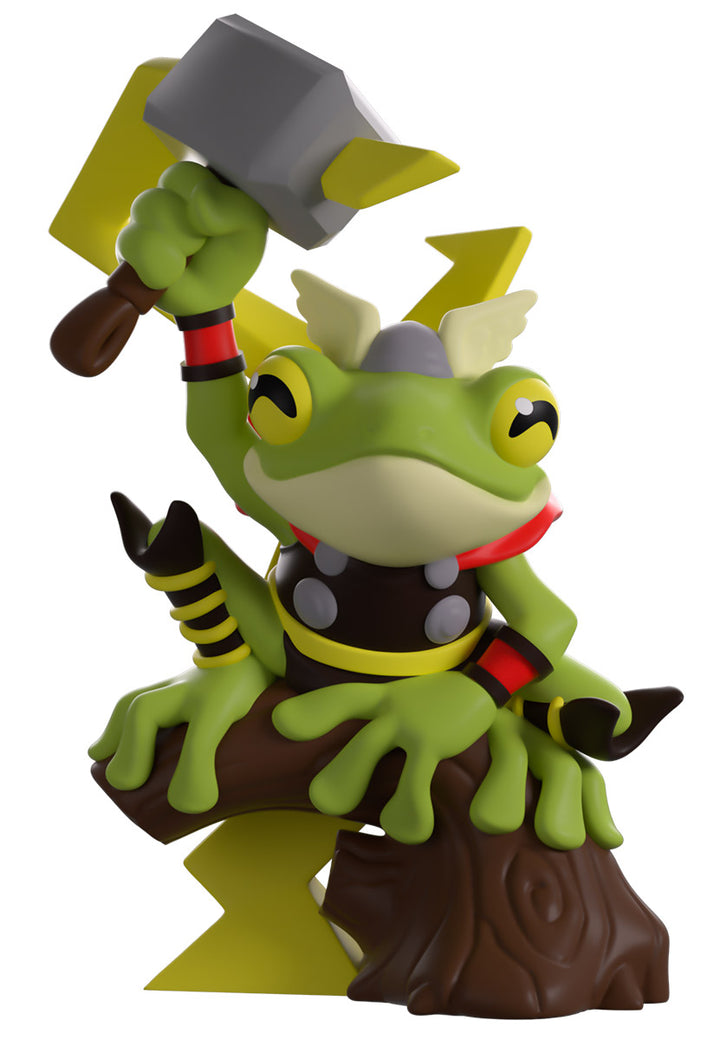 Can you hear the thunder rumbling in the distance? Can you see the lightning?! It can only mean one thing, the God of Thunder is here! Wait a minute… Who's this?! Perched atop a gnarled wooden log at 5.4 inches tall and raising Frogjolnir high in the air as it sends a jagged streak of electricity behind him, a wide smile crosses his amphibian green face as a winged helmet sits on his head. With a pair of huge glistening yellow eyes, he’s dressed in proper Asgardian attire with a tunic and long flowing red cape as he wears wrist and shin guards. The exterior of his packaging sees him perched atop a branch as lightning streaks around him, while the interior is filled with radiating golden beams of light. The protective sleeve then continues the lightning across it as his figure can be seen through the large clear window at the packaging’s front. This collectible ships in a matte, embossed, protective outer sleeve and a custom sized plastic protector for maximum protection during shipping.