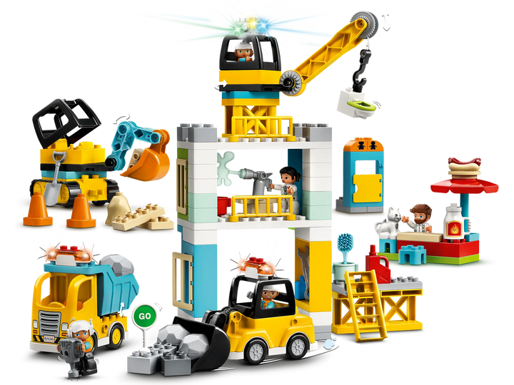 With 5 contemporary characters – a female painter and crane driver, 2 male construction workers and a hotdog guy – plus lots of cool features, such as light and sound bricks and the bulldozer's push-and-go friction motor, the set engages, entertains and inspires young imaginations. To expand the play benefits even further, combine it with other LEGO DUPLO Construction sets.