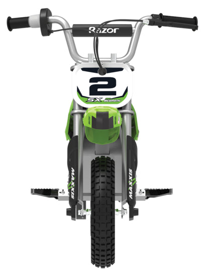 The Razor Dirt Rocket SX350 McGrath 24 Volt is the perfect introduction to motocross for young riders, inspired by the legendary supercross champion Jeremy McGrath. This scaled-down dirt bike features authentic MX-frame geometry and motocross-spec 12” pneumatic knobby tires, designed to handle a variety of terrains from soft dirt to muddy trails with ease.