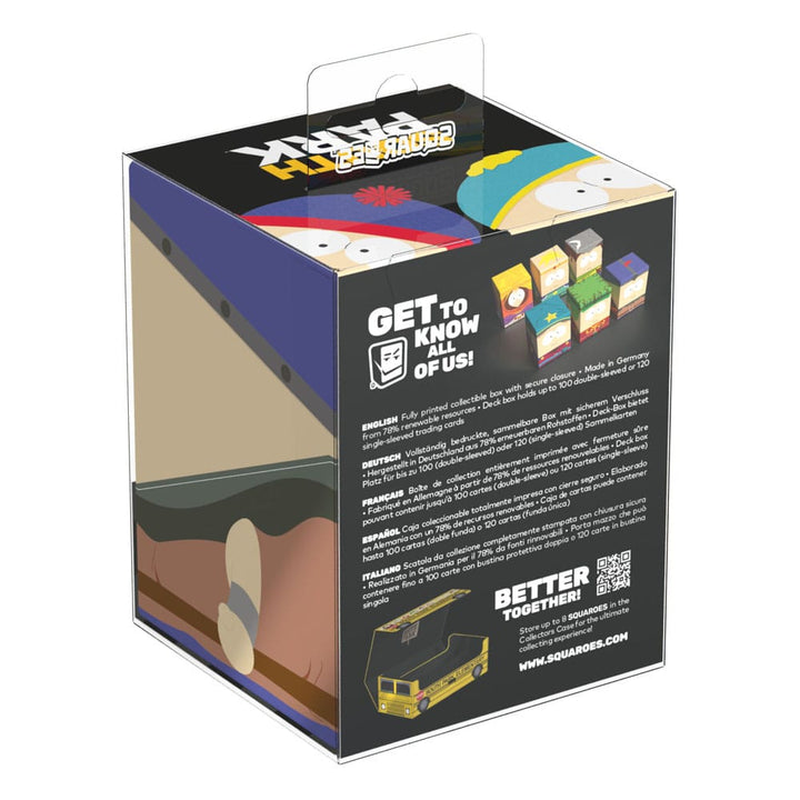 Collectible box for storing TCG decks, tabletop gaming accessories, and/or collectibles. Each Squaroe from the South Park™ edition holds up to 100 cards in double protective sleeves if used as a deck box. Squaroes are made from 78% renewable recources and fit perfectly into the separately available Collectors Case.