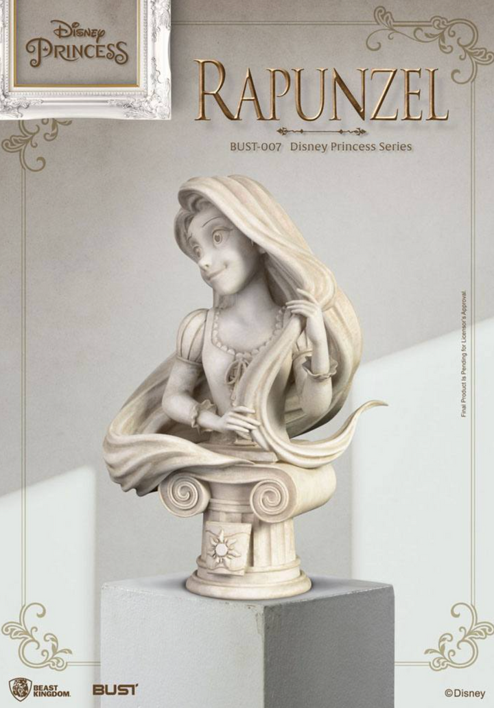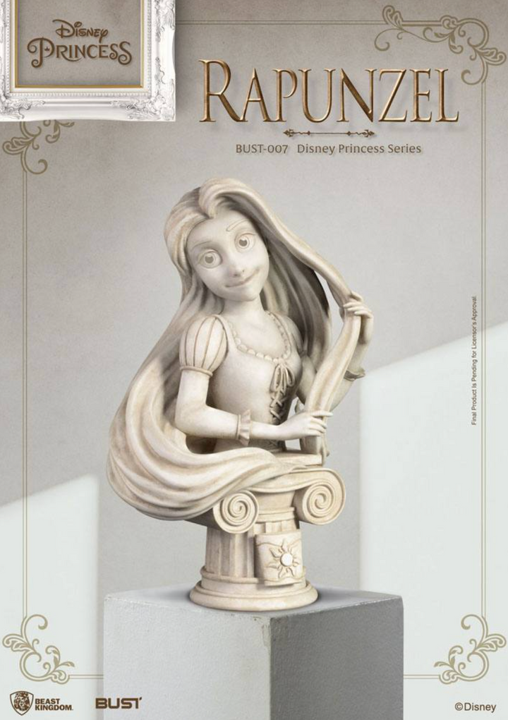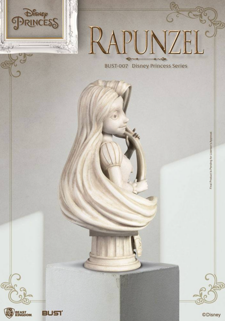Beast Kingdom is proud to present the latest plaster-portrait 'BUST' series focusing on a selection of classic Disney Princess characters. The Rapunzel bust on show exemplifies the delicate, timelessness and charm of the beloved animated character. Each bust includes a base with an engraving of a special emblem that represents a theme from their respective movies!