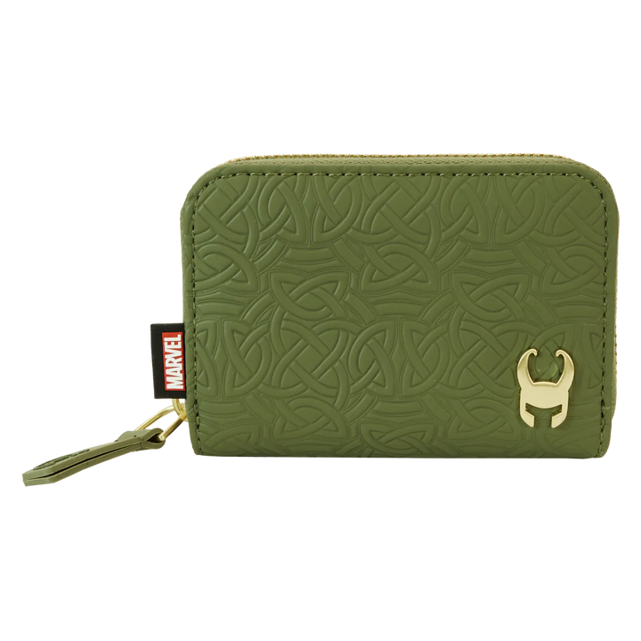 The Loungefly COLLECTIV Marvel Loki The ORGANIZR Accordion Wallet is made of vegan leather (polyurethane). Wallet zips closed and has sturdy gold-coloured metal hardware. Additional features include printed, debossed, silicone, and metal rivet details. Take note of the coordinating inside lining.
