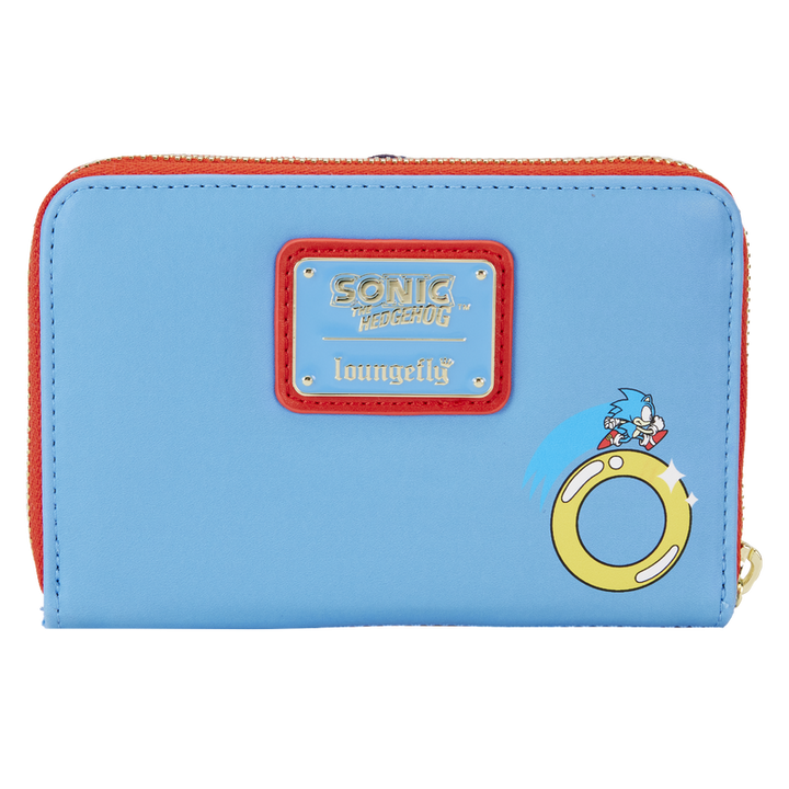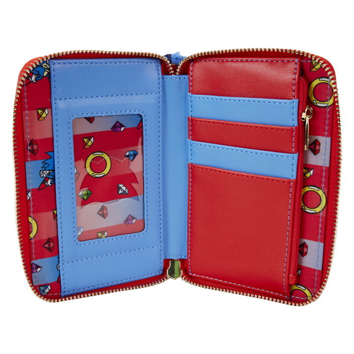 Chime in to add a new fan-favorite to your wardrobe! Our Loungefly Sega Sonic the Hedgehog Classic Cosplay Zip-Around Wallet is the perfect way to boost your day. This accessory features Sonic the Hedgehog, his face rising up over the front of the wallet and coming to life in applique, blue plush, and embroidered details. Red trim adds a pop of complementary color, and on the back, Sonic makes an encore appearance as a print, speeding over a shiny golden ring. Inside, you’ll find four slots for holding cards and one clear slot for displaying your ID. The die-cut shape of Sonic’s face, on the clear ID slot, adds a touch of character.