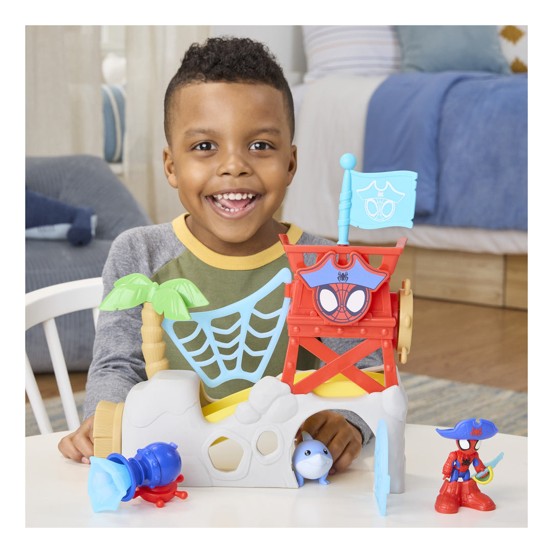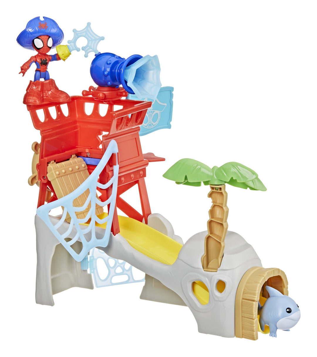 Kids can imagine swashbuckling action and adventure with the Marvel Spidey and his Amazing Friends WaterWebs Spidey Island, from Hasbro! Playset comes with a poseable 3-inch (7.6 cm) Spidey toy, as well as Jeff the Landshark slug figure, and features a trap door with slide, cave capture, and more. Transform Spidey into Pirate Spidey with detachable pirate hat, boots, and hook accessories. Also comes with removable palm tree, flag, and web cannon that the Spider-Man figure can hold with his c-grip hand! Encourage imaginative pirate play for boys and girls ages 3 and up, with more Marvel Spidey and his Amazing Friends toys, including figures, toy vehicles, and playsets! Cool Marvel toys make great gifts for kids, on birthdays, holidays & other special occasions! (Each sold separately. Subject to availability.)
