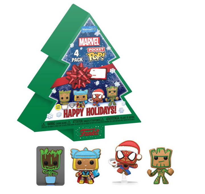 • Cook up some fun with these delectably daring Pocket Pop! gingerbread versions of Marvel heroes. This Walmart-exclusive 4-Pack Set has Gingerbread Thor, Gingerbread Baby Groot, Gingerbread Spider-Man, and Gingerbread Groot popping off the cookie sheets in bite-size form. Pop! Gingerbread Baby Groot glows in the dark and Pop! Gingerbread Thor sparkles with diamond glitter details. Expand your Marvel set with these sweet superheroes, wrapped up in a Christmas-tree-shaped box. Vinyl collectibles are approximately 4.1-5.5cm tall.