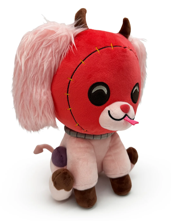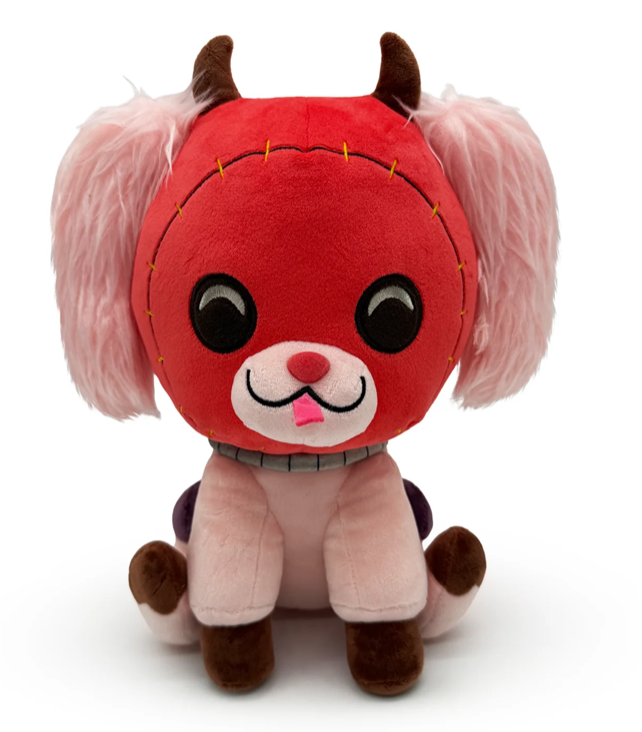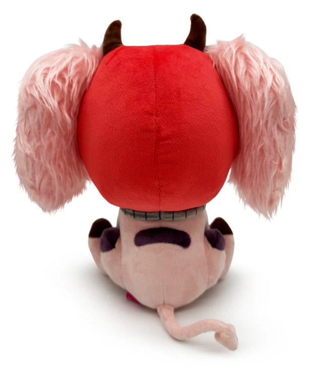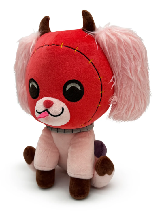 What are all these dead bodies doing here? Wait… Is that one moving?! Kikurage, is this your doing?! Sitting at 9 inches tall with round black eyes and a short forked tongue sticking out from a smiling muzzle, their head is covered in a stitched red mask with a pair of fluffy ears fanning out from either side as short horns poke out front the top. Wearing a grey collar around their neck and with hooved paws propping them up, their light pink body has dark marks on the haunches as a thin pointed tail sticks out from their back. This plush is packed to the seams with 100% PP cotton and is made of a mixture of minky and fur materials, absolutely perfect for cuddling and playing with bugs!
