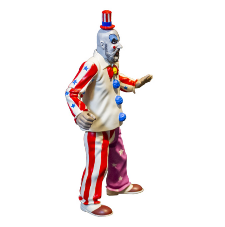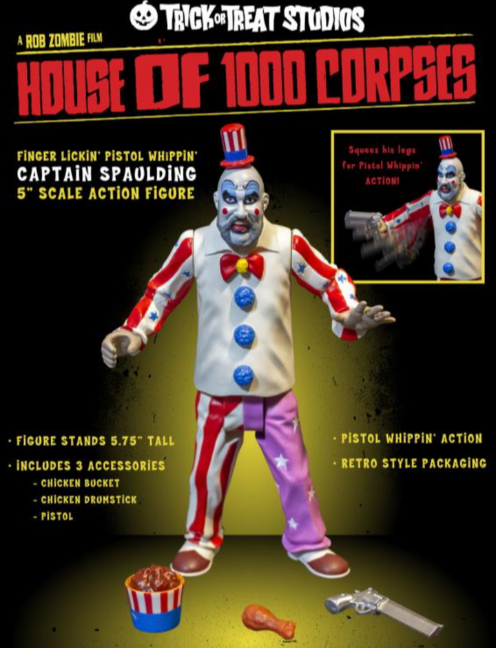 Add your favorite crazy clown to your collection with this 5 inch scale Captain Spaulding action figure! Captain Spaulding includes a fried chicken meal and pistol whippin' action when you squeeze his legs together!
