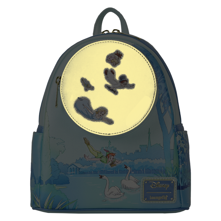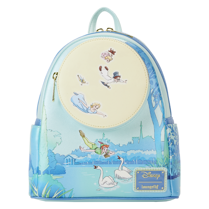 The happiest thoughts can make your adventures take flight! Set your sights on the Loungefly Peter Pan You Can Fly Glow Mini Backpack, where the Darling siblings soar to Neverland with the help of their new friends. On the front, Peter Pan coasts along a river while playing the flute for some swans. Up above, a moon-shaped zipper pocket shows Wendy, John, Michael, and Tinker Bell as they swoop through the night sky. Turn down the lights to see the moon glow! As the London riverside continues onto the bag’s side pockets, Tinker Bell escapes a fishy situation on the bag’s back. This mini backpack adds a touch of whimsy to any outfit and will keep your belongings safe throughout your travels.