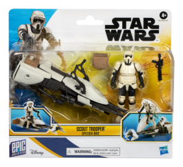 Imagine action-packed chase scenes with the Star Wars Epic World of Action Scout Trooper & Speeder Bike. This scout trooper action figure easily fits on the included speeder bike, featuring adjustable handlebars and footholds. Kids will love the vehicle’s crash and eject feature, which launches the scout trooper from the bike on impact. Standing at 4 inches tall (10 cm) and featuring 9 points of articulation, this action figure for kids is the perfect addition to your little fan's collection. Look for even more figures and vehicles to collect across Hasbro's Epic World of Action, featuring kid-favorite characters and entertainment-inspired design. (Each sold separately. Subject to availability.) Star Wars products are produced by Hasbro under license from Lucasfilm Ltd. Hasbro and all related terms are trademarks of Hasbro.