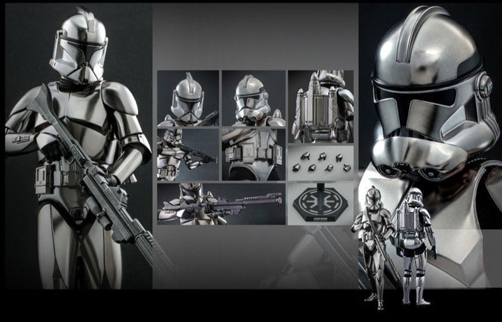 Hot Toys are pleased to introduce a displayable special variant of the Clone Trooper Sixth Scale Collectible Figure in silver chrome colour as an exclusive item only available in select markets.