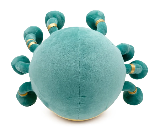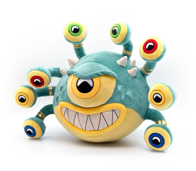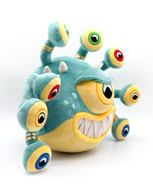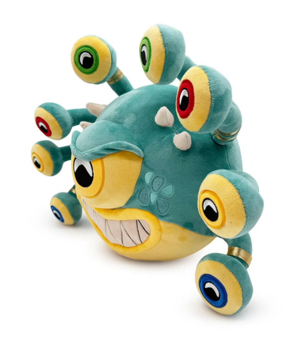 Xanathar has arrived at Youtooz for his plush debut and boy is he sure a sight for sore eyes! Get it… eyes… because of all his eyes… At 9 inches tall with a huge toothy smile curving underneath a giant glaring eye that sits at the center of his round body, his light yellow undercarriage leads into a muted green top as light marks speckle his cheeks. With a trio of short horns sticking out from either side of his body, he wears golden bands on his long eyestalks which each end in different coloured eyes. This plush is packed to the seams with 100% PP cotton and is made of a mixture of metallic and minky materials, absolutely perfect for cuddling or watching and watching and watching and watching.