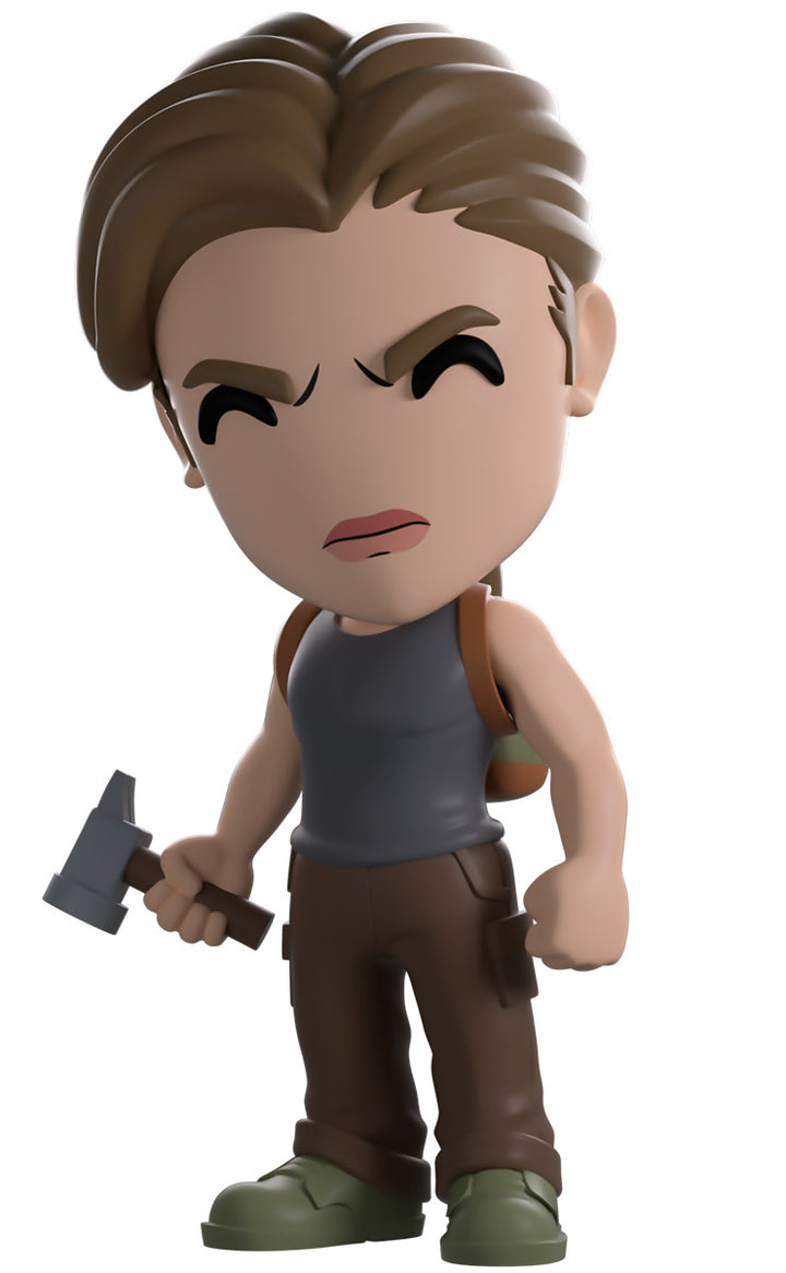 Abby’s quest for revenge has led her through infected overrun fields and cities to arrive at Youtooz! Standing at 4.7 inches tall with a scowl on her serious face as she lowers her head, her hair is pulled back into a long braided ponytail that falls down her back. Holding a hammer in her right hand, she wears a blue tank top that shows off muscular arms along with baggy brown cargo pants and sturdy boots while a green backpack is slung over her shoulders. The exterior of her packaging sees her silhouette ready to take down a Clicker by the light of a burning car. The interior is then a stark white, while the protective sleeve casts an eerie orange glow of a ruined dilapidated city as her figure can be seen through the large clear window at the packaging’s front. This collectible ships in a matte, embossed, protective outer sleeve and a custom-sized plastic protector for maximum protection during shipping.
