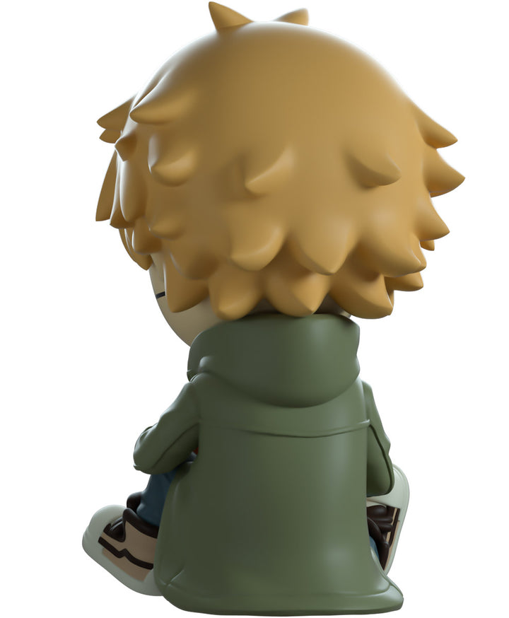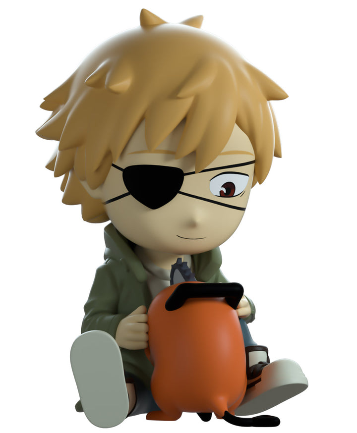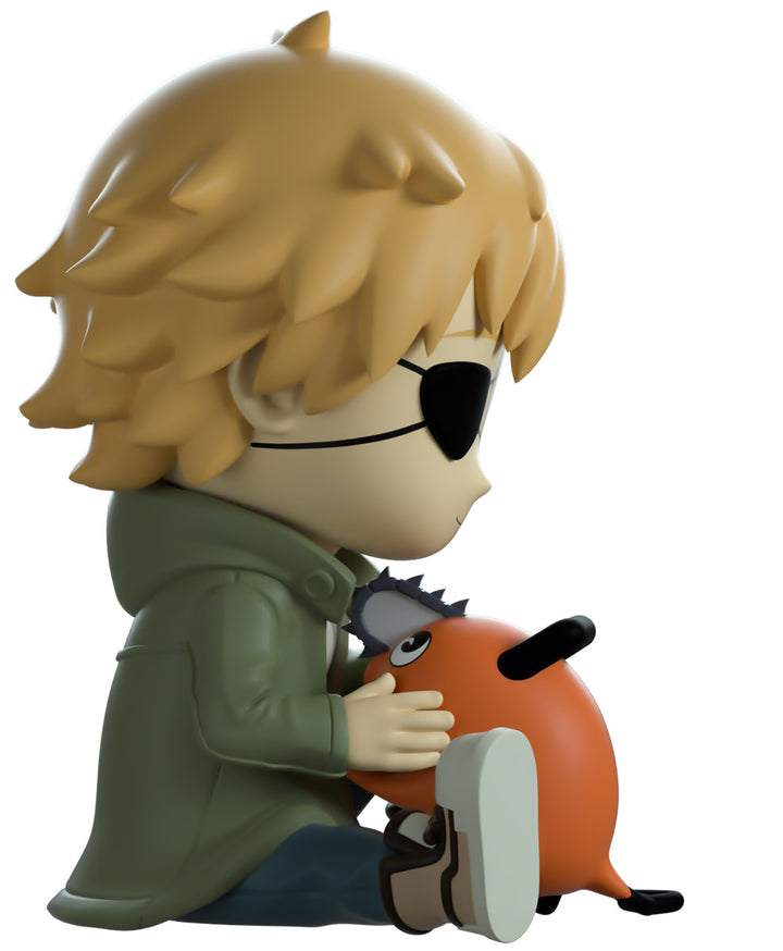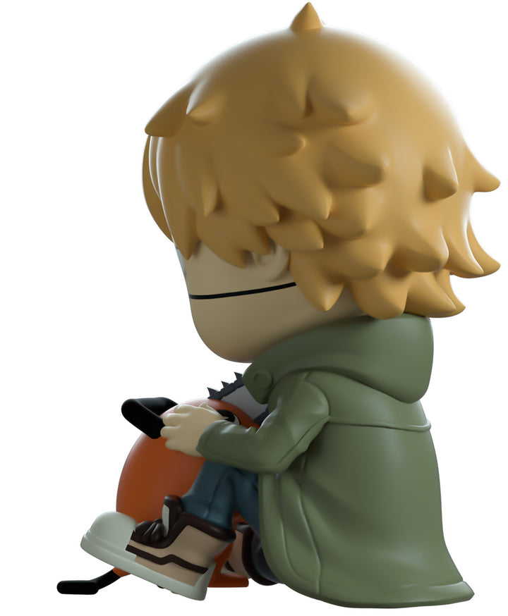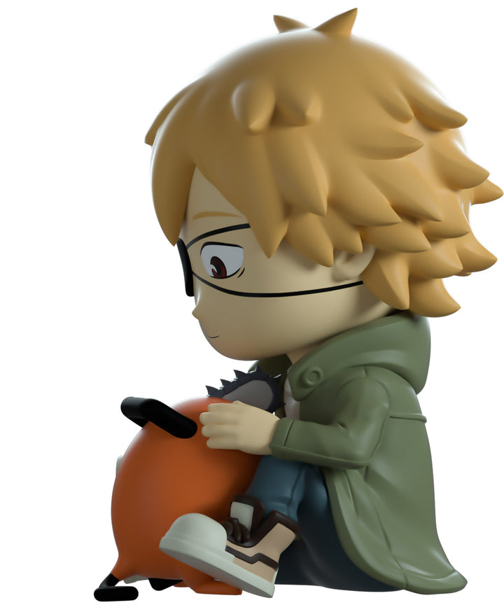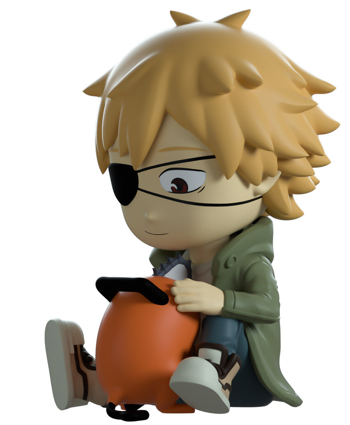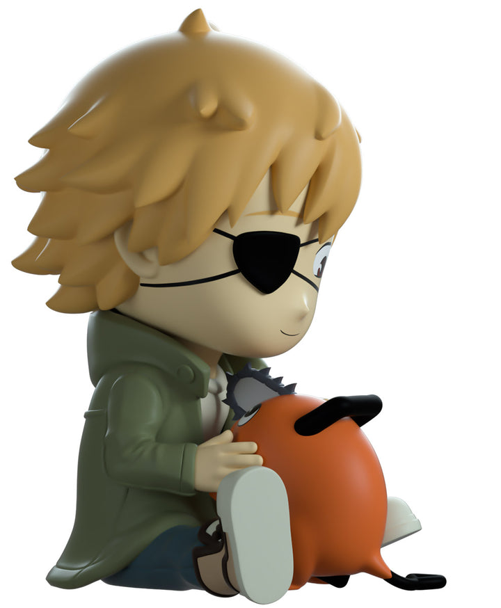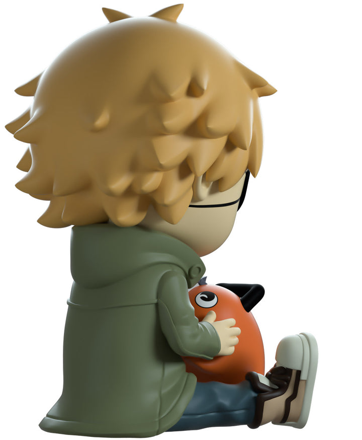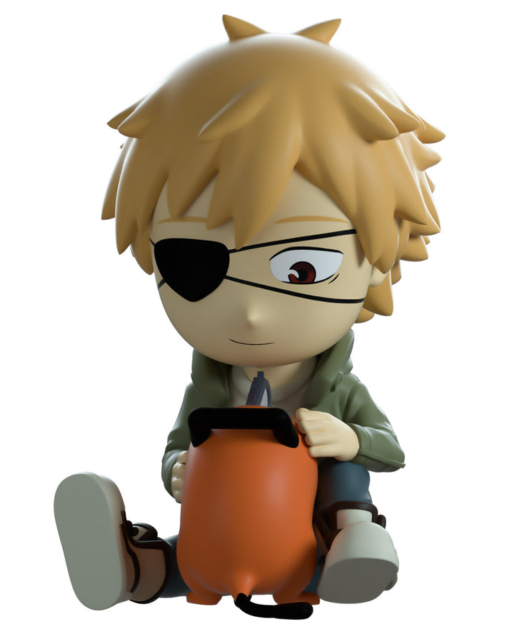 The best boys arrive at Youtooz to showcase the purest friendship imaginable! At 3.8 inches tall, Denji is posed sitting with a leg extended and his hands placed on Pochita’s head as he looks down at him lovingly from his remaining eye. His mess of blonde hair falls down over the black eyepatch that sits over his right eye as he wears a long green trench coat on top of a white shirt and blue jeans. Pochita sits between Denji’s legs, with his vibrant orange body propped up by the tiny paws resting on Denji’s front as he stares up at his best friend full of adoration! The exterior of their packaging is an off-white stamped with kanji and splattered in a bright orange spray which also covers the mottled brown interior. The protective sleeve shows Denji & Pochita in front of the splatter that bleeds white the green background as their figures can be seen through the large clear window at packaging’s front. This collectible ships in a matte, embossed, protective outer sleeve and a custom sized plastic protector for maximum protection during shipping.