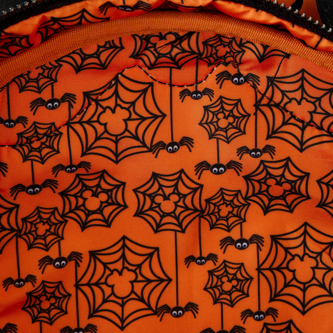 Yoo-hoo and boo! Be scary fashionable with our Loungefly Disney Minnie Mouse Spider Mini Backpack. This spooktacular spider-shaped accessory has a round, domed front featuring Minnie Mouse’s sweet face. Her orange bow, which complements the sleek black-coloured design, rises up over the top, and her spider legs stick out—four on each side. Her applique ears have webs inside, and in the dark, these webs, and the features on Minnie’s face, glow! You’ll also find a wickedly wonderful web print on the back with two delightful spiders dangling from threads. Take off on spirited adventures and leave a delightfully haunting impression wherever you go.
