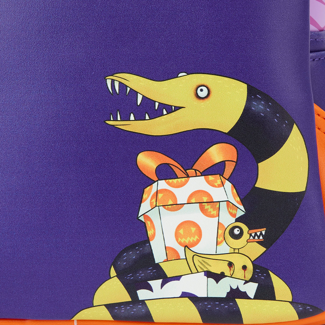 The Loungefly Nightmare Before Christmas Scary Teddy Present Mini Backpack is made of vegan leather (polyurethane). Bag has adjustable shoulder straps and gunmetal-coloured hardware. Additional features include applique, embroidered, glow-in-the-dark, and printed details. Take note of the coordinating inside lining.