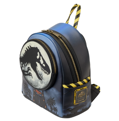 Welcome to Jurassic Park! Celebrate a larger-than-life adventure with the Loungefly Jurassic Park 30th Anniversary Dino Moon Mini Backpack. Journey to a land frozen in time as you enter the gates located on the bag's front. Up above, an ominous silhouette appears on a moon-shaped zipper pocket that glows in the dark. Turn the bag around to find caution tape details highlighting the side pockets and shoulder straps, along with the film's 30th-anniversary logo on the back. Perfect for tourists on the go, this mini backpack will keep your essentials safe as you start your next expedition. The Loungefly Jurassic Park 30th Anniversary Dino Moon Mini Backpack is made of vegan leather (polyurethane). Bag has adjustable shoulder straps and sturdy metal hardware. Additional features include applique, embossed, and printed details. Take note of the coordinating inside lining. Backpack dimensions: 24.1cmW x 26.6cmH x 11.4cmD