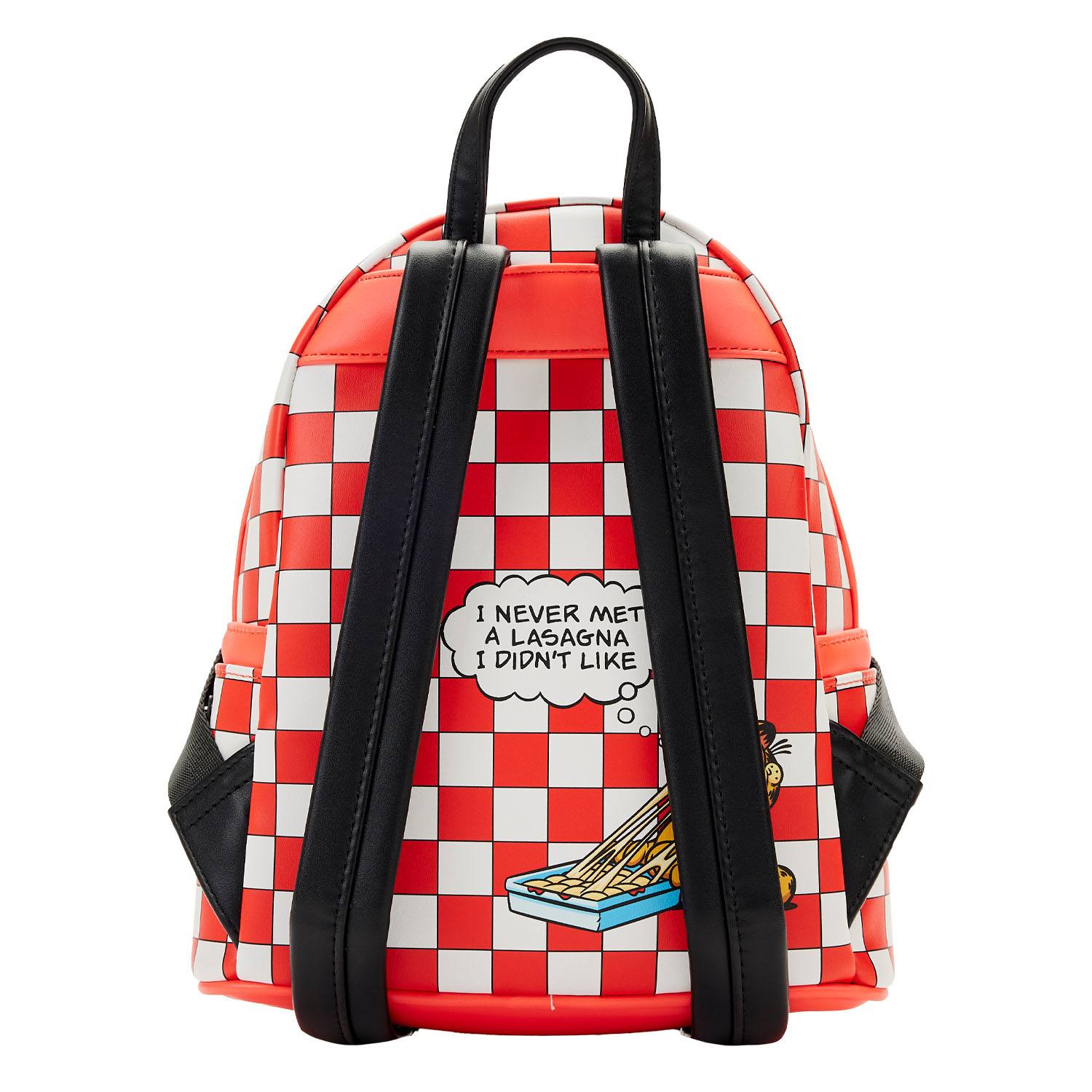 The entire backpack is covered in a red-and-white checkered tablecloth, and on the front, a large plate of lasagna sits before Garfield. His face comes to life in applique detail, and his tongue sticks out in anticipation of a tasty meal.