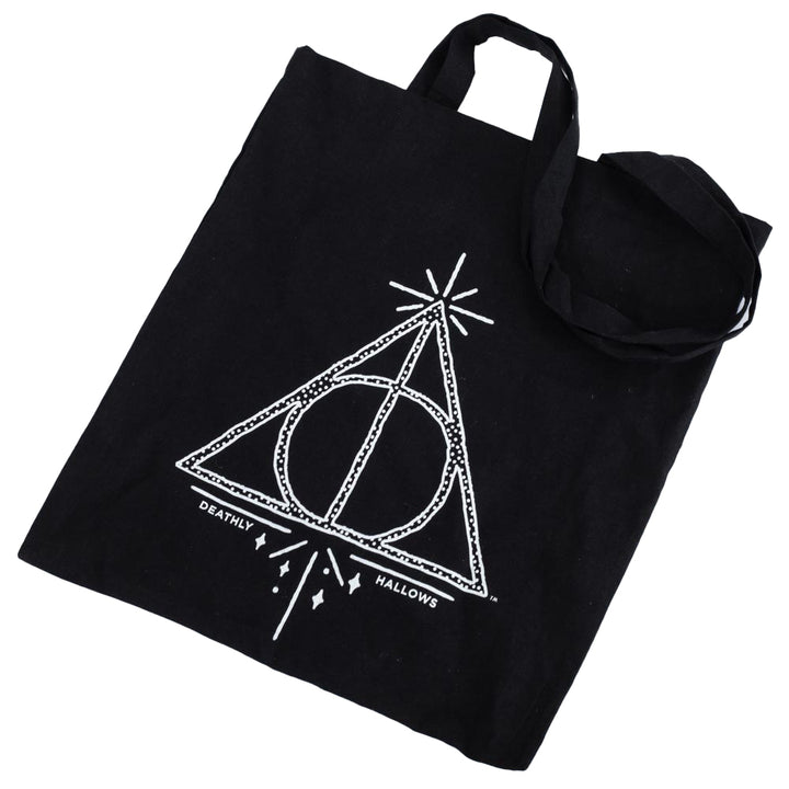 Black canvas tote bag featuring the Deathly Hallows sign in white