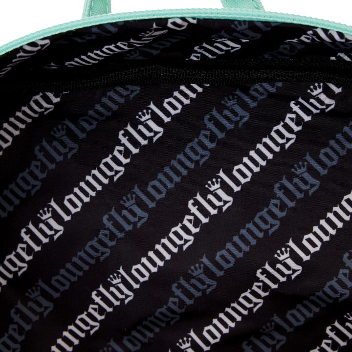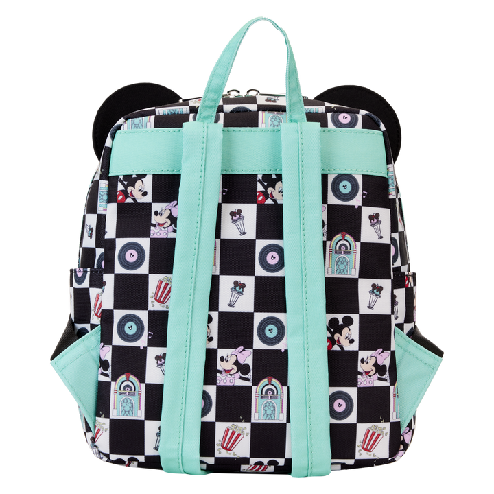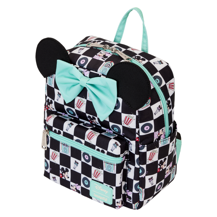 Select a song from the jukebox and prepare to dance! Our Loungefly Disney Mickey Mouse and Minnie Mouse Date Night Diner All-Over-Print Nylon Mini Backpack is ready for fun. This backpack features an all-over black-and-white checkered pattern, reminiscent of a dance floor in a 1950s diner. Inside the white checkered boxes, you’ll find printed images of records, jukeboxes, Disney’s Mickey Mouse and Minnie Mouse, popcorn, and ice cream sundaes. Signature Mickey Mouse ears also pop up on top. Accents of teal, including a 3D bow, add a retro pop of colour, and a front zipper compartment secures smaller items for your journey. Bring your plus one, and this backpack, to kick up your heels in style.