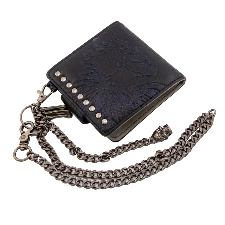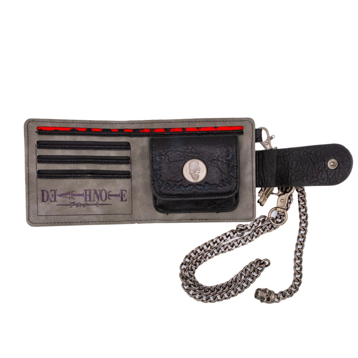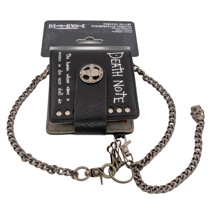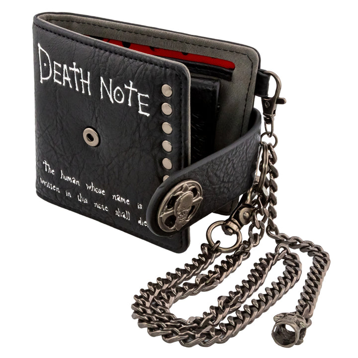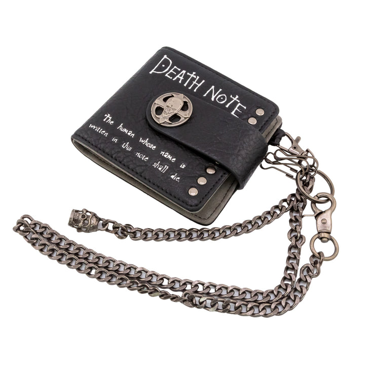Black faux leather premium wallet with silver text that reads "The human whose name is written in the note shall die."