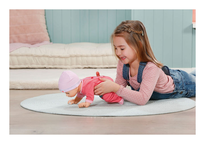 Set her into the crawling position and she will crawl by herself! Start her off on all fours and watch as she struggles to crawl, you might hear some crying sounds but that's not for long, Emily is clever and soon she's off, crawling along the floor! Push her tummy button and she’ll do it again and again. You can even help her take her first steps. Carefully click her into the standing position by straightening her legs and pulling her arms up and then hold her hands whilst she starts to walk with your help. Don’t worry, if she stumbles and starts to cry, you can quickly soothe her with a cuddle and patting her on her back. When sitting upright, you can tilt her backwards and watch her kick her legs and move her arms whilst making the cutest baby sounds when you press her belly button. After all that hard work, when it’s time to sleep Emily will make yawning and sleeping sounds when rocked and her eyes close when laid down for bed.