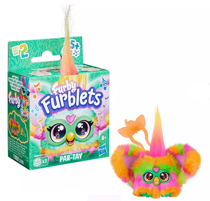 Good vibes all around with Par-Tay the funky Furblets friend! Hear over 45 disco tunes and sounds with this mini Furby electronic toy for girls and boys aged 6 years and up. Par-Tay has green, pink and orange fur to look like a tiny piñata. Also plays fun music and sounds in Furbish (but doesn't speak human languages). Clip them to a backpack or other travel bag with the keychain clip to bring the Furblets toy wherever you go.