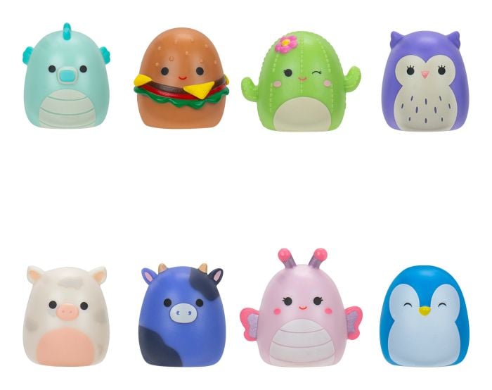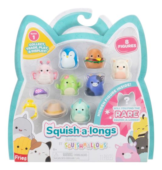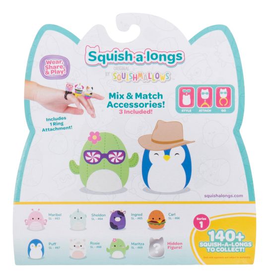 Get ready for a new level of squish with Squish-a-longs, the latest addition to the Squishmallows family! An adorable and portable collectible, Squish-a-longs Mini-Squish, made of squeezable plastic, is perfect with its 1-inch size! The fun is endless, with over 140+ Mini-Squish to collect, trade, play, wear, and display! Show off your fandom by wearing the ring and dressing your Mini-Squish with fun accessories like the included glasses and cowboy hat. You can ensure you get them all with the helpful collector's guide. Take advantage of the ultimate Squish fun - start your Mini-Squish collection today! Includes: (8) 1” Mini-Squish (2) Accessories (1) Ring (1) Collector’s Guide (2) Styles to Collect